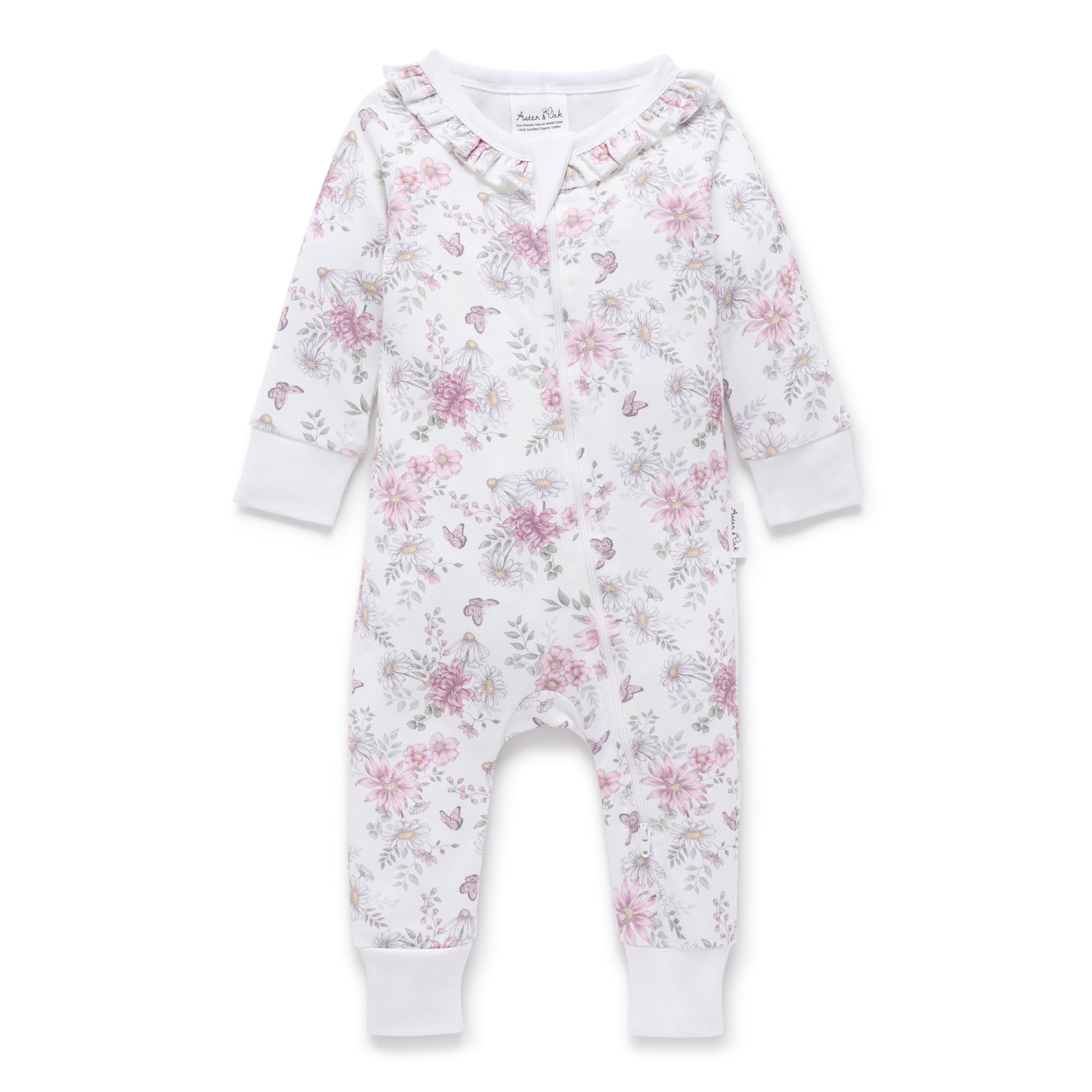 Made from GOTS certified organic cotton, this long sleeve romper comes with all over daisy floral print, frill to neck line and premiumm YKK two way zipper with protective backing. NOTE sizes NB and 0-3m come with fold over hand and feet cuffs. 100% Certified organic cotton #USB008294. Made in India. Wash according to care instructions.