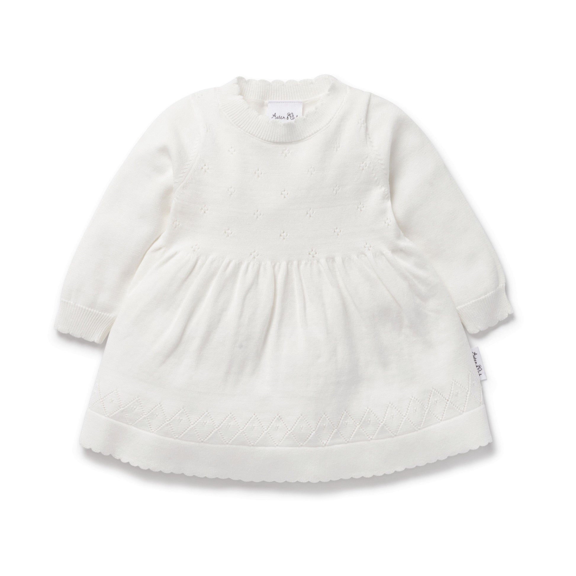 Made from natural cotton knit, the long sleeved dress features scalloped edging neck, cuffs and hem, pattern to hemline and delicate pointelle stitching to top. 100% Cotton. Made in China. Wash according to care instructions.