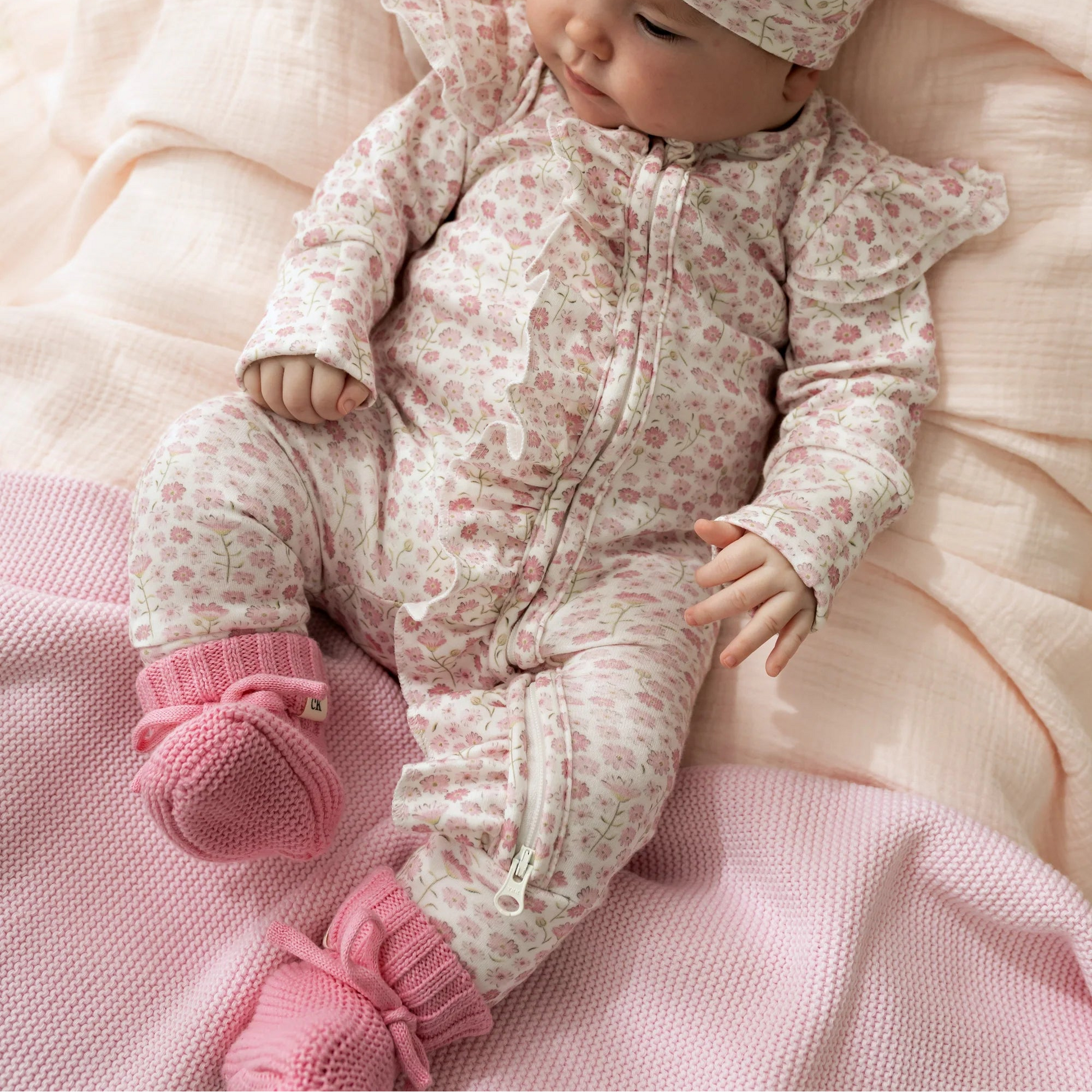 Meet the feature print girls’ zipsuit of this capsule: Seashell Bloom—pink florals on buttery-soft fabric, finished with a premium YKK double-ended zip, fold-over mittens and enclosed feet for cosy, all-season comfort.