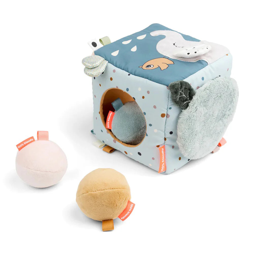 Leaves that crinkle, a soft baby mirror and Croco hiding behind the door are just some of the cool features of this cube. Hide your own treasures inside the cube or use the three squeezable rattle balls in cute colours that are included.