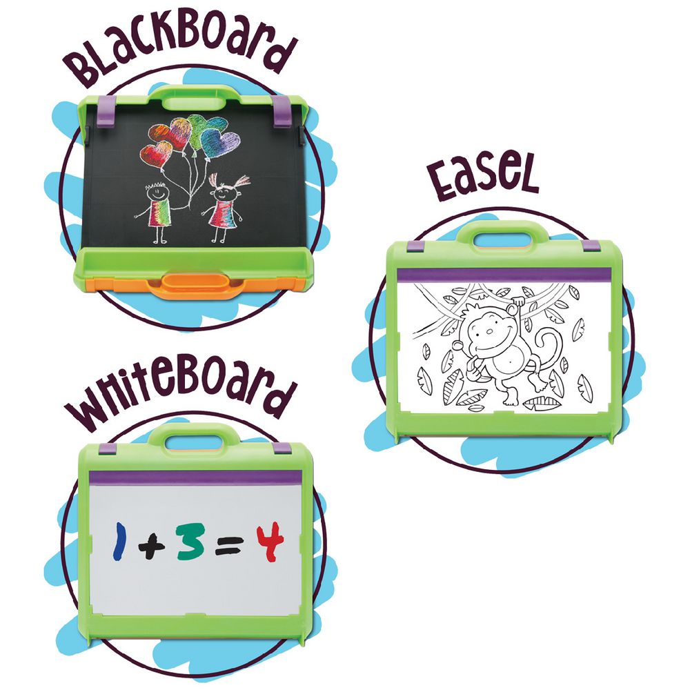 Get creative with this all-in-one carry-along deluxe easel set! This handy case opens out to reveal a blackboard on one side and a whiteboard on the other, plus a drawer full of chalk, pencils and whiteboard markers! Kids can choose to draw directly onto either side, or attach their own paper to the whiteboard to use it as an easel for drawing and colouring. Ready, set, create!