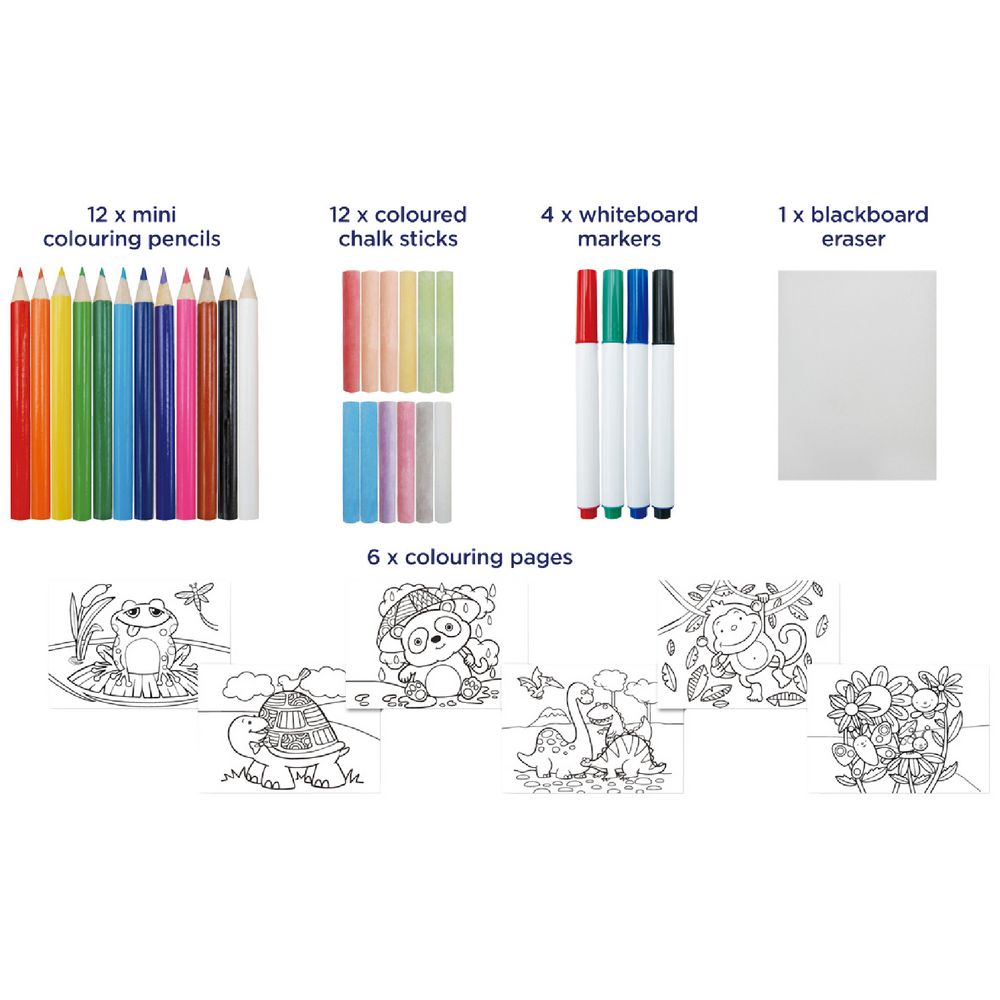 - This set contains 12 x coloured chalk, 12 x mini coloured pencils, 6 x drawing paper sheets, 3 x coloured whiteboard markers, 1 x chalk eraser, and 1 x plastic easel with contents drawer.