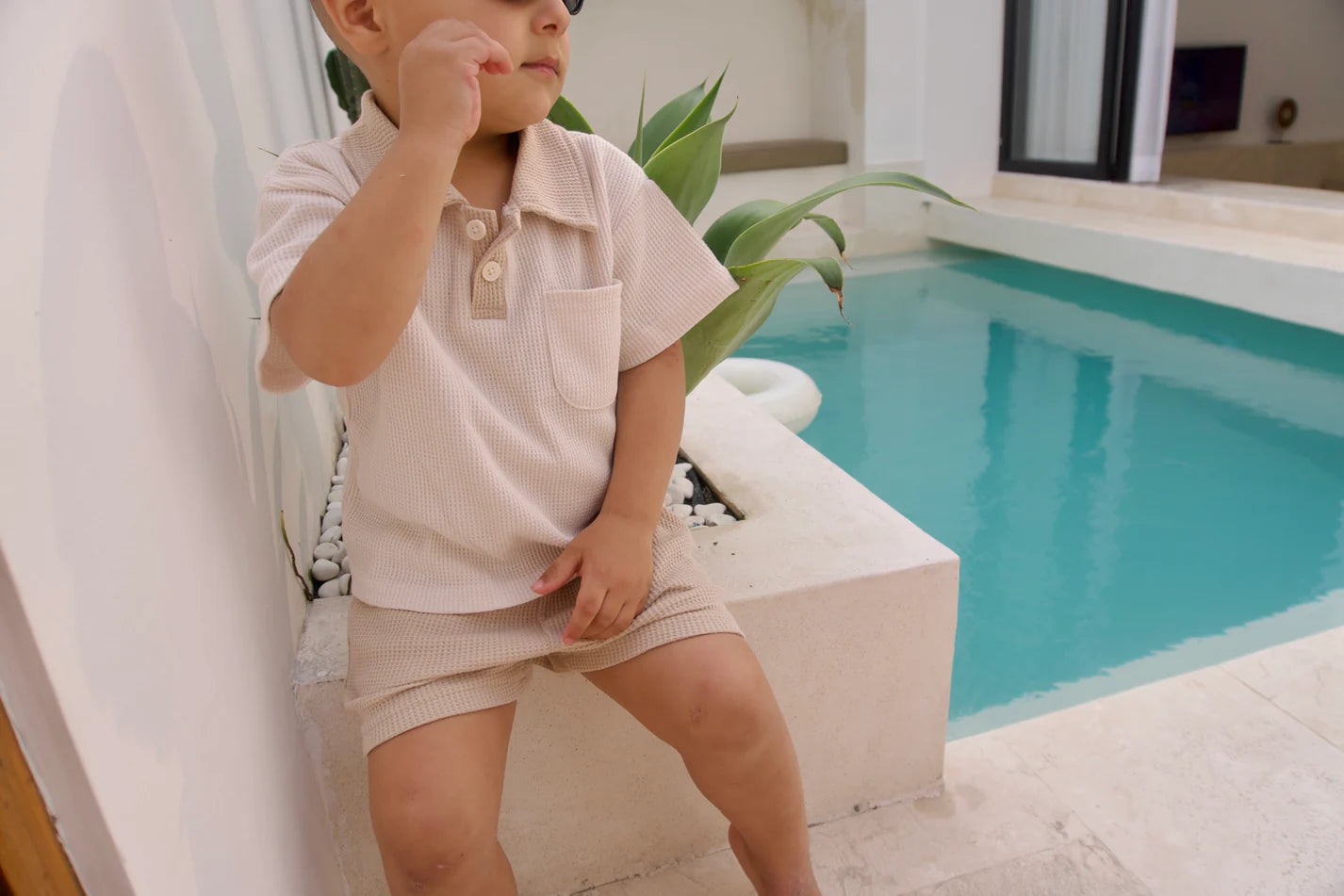 The Louie set features a waffle design in a cream and coffee colour combo. Lightweight and comfortable fit for your little ones!