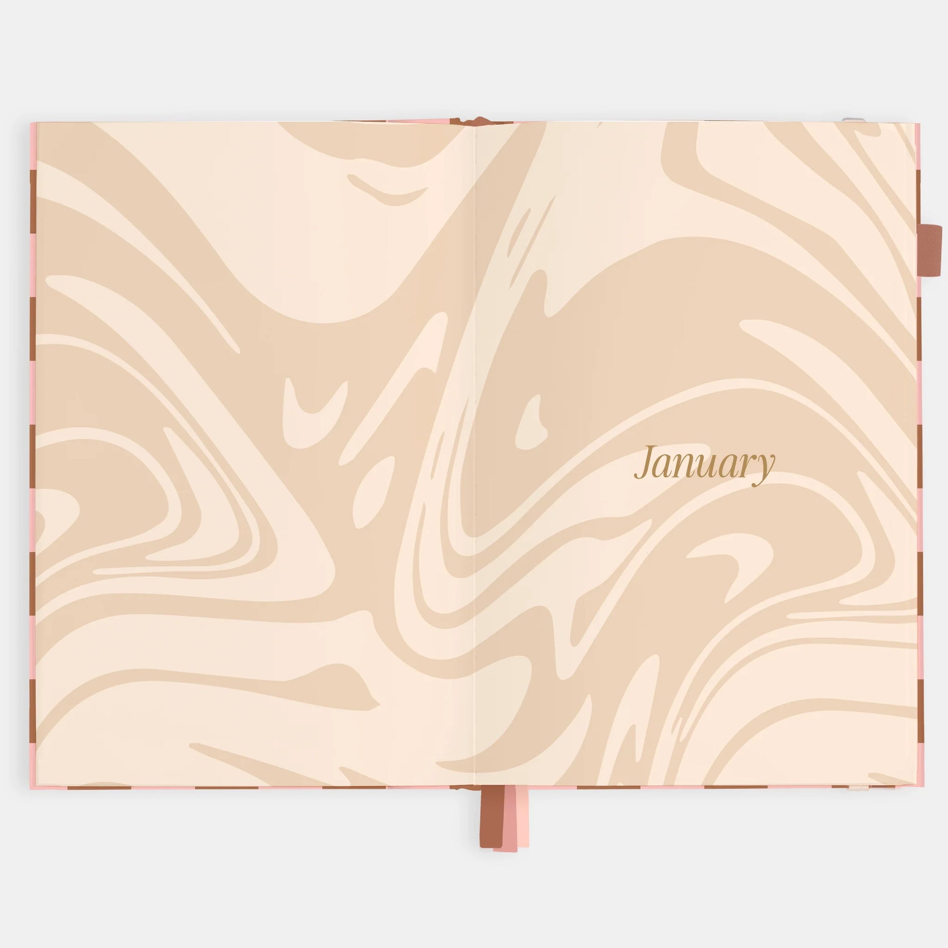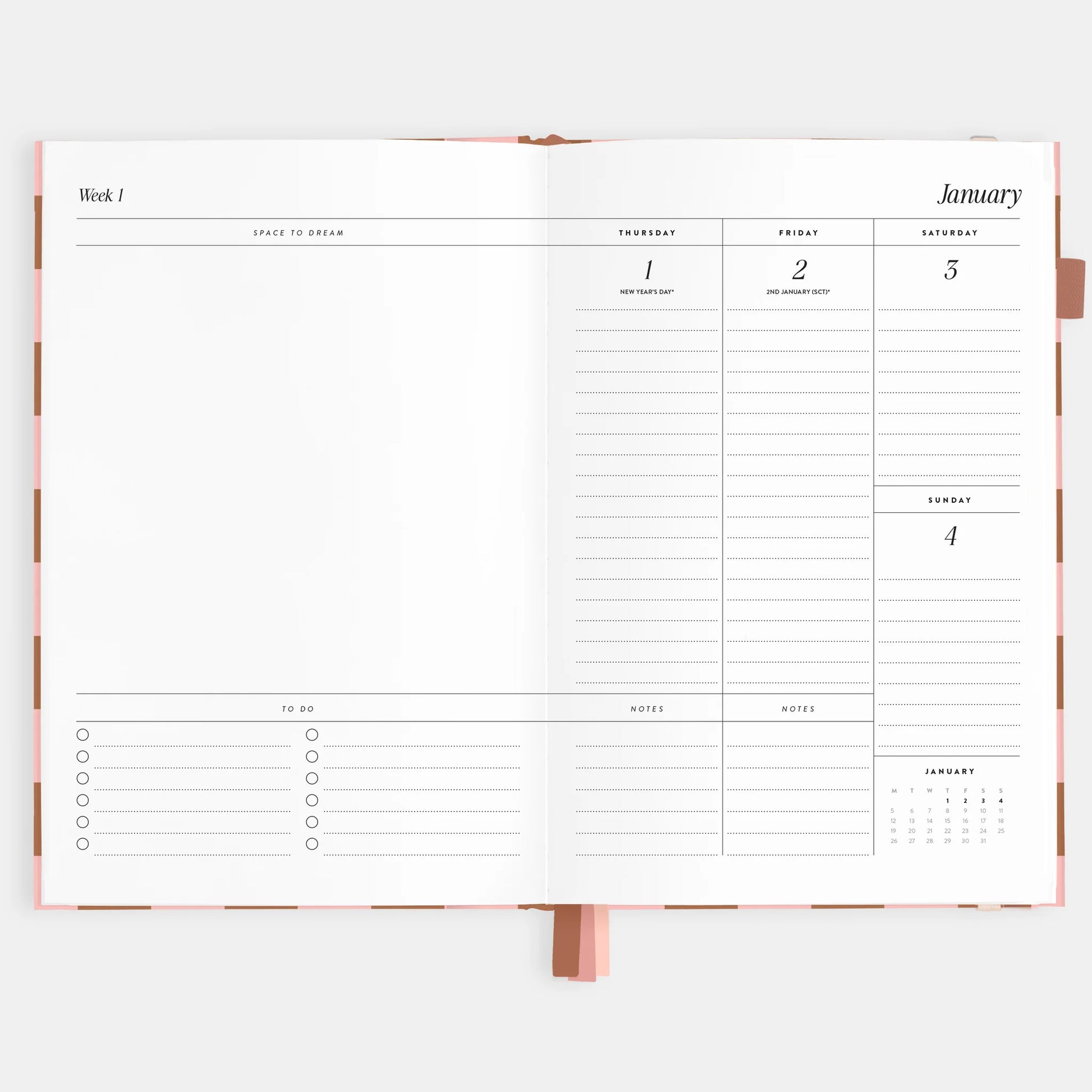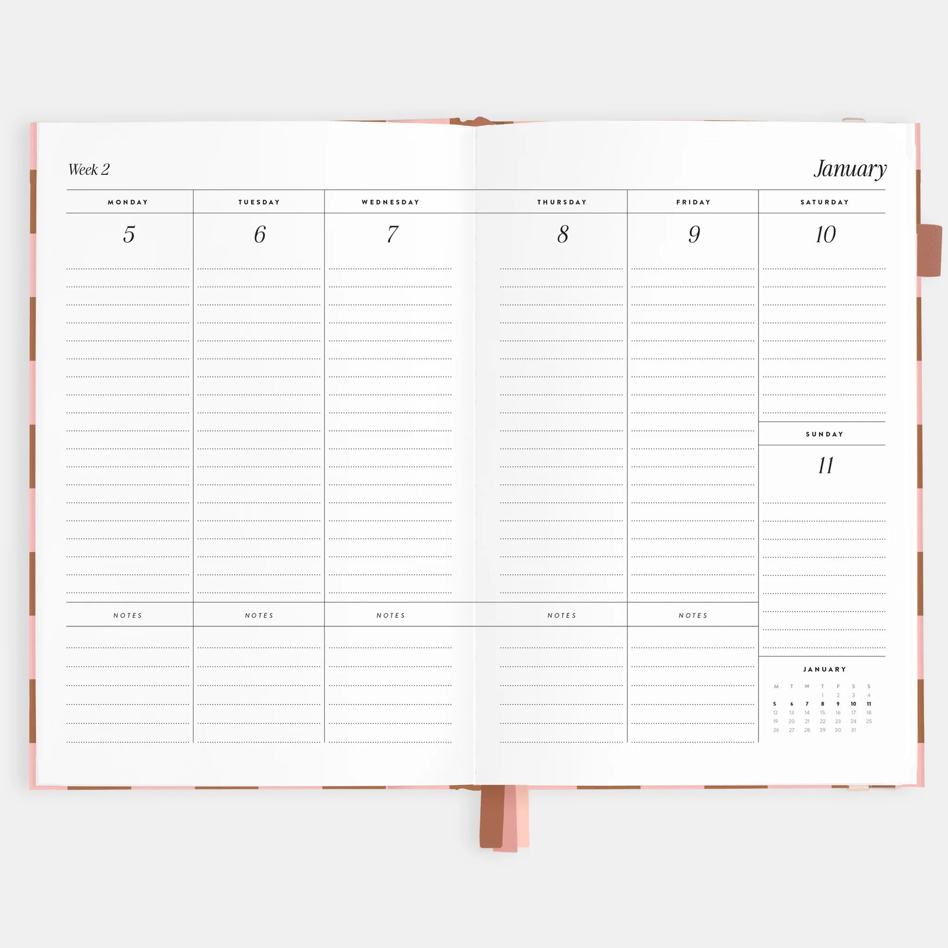 208 pages. One week per spread and monthly spreads at the beginning of each section. Gold foil stamped linen cover with gold foil edging. Three grosgrain ribbons in rust, blush and cream.