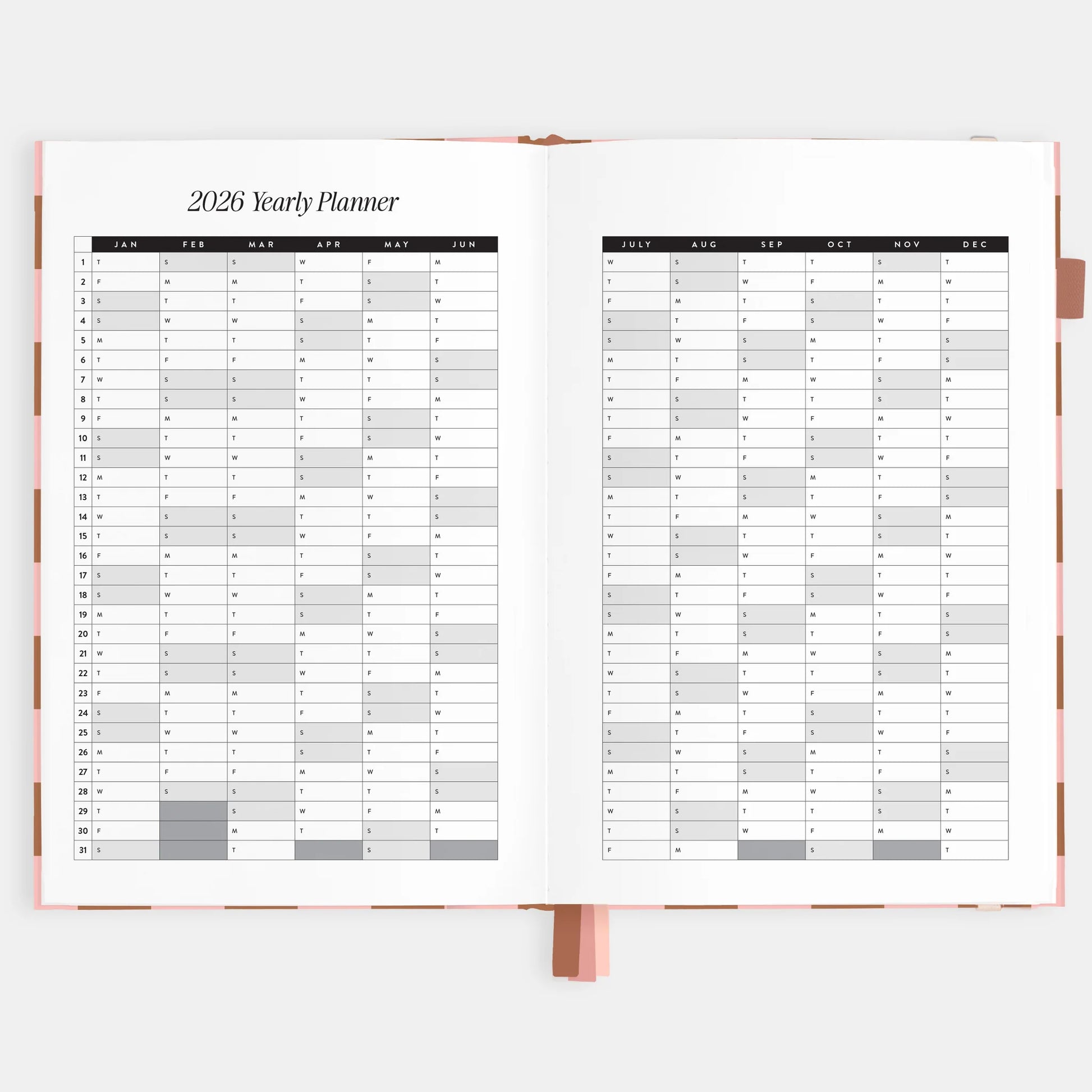 Each 2026 planner has been designed to be beautiful, functional and long-lasting, with patterned end pages, three ribbons and premium 120gsm FCS-certified paper. Holidays & observances for Australia, USA, Canada, UK & New Zealand. Packaged in a cello sleeve with gold foil bellyband.