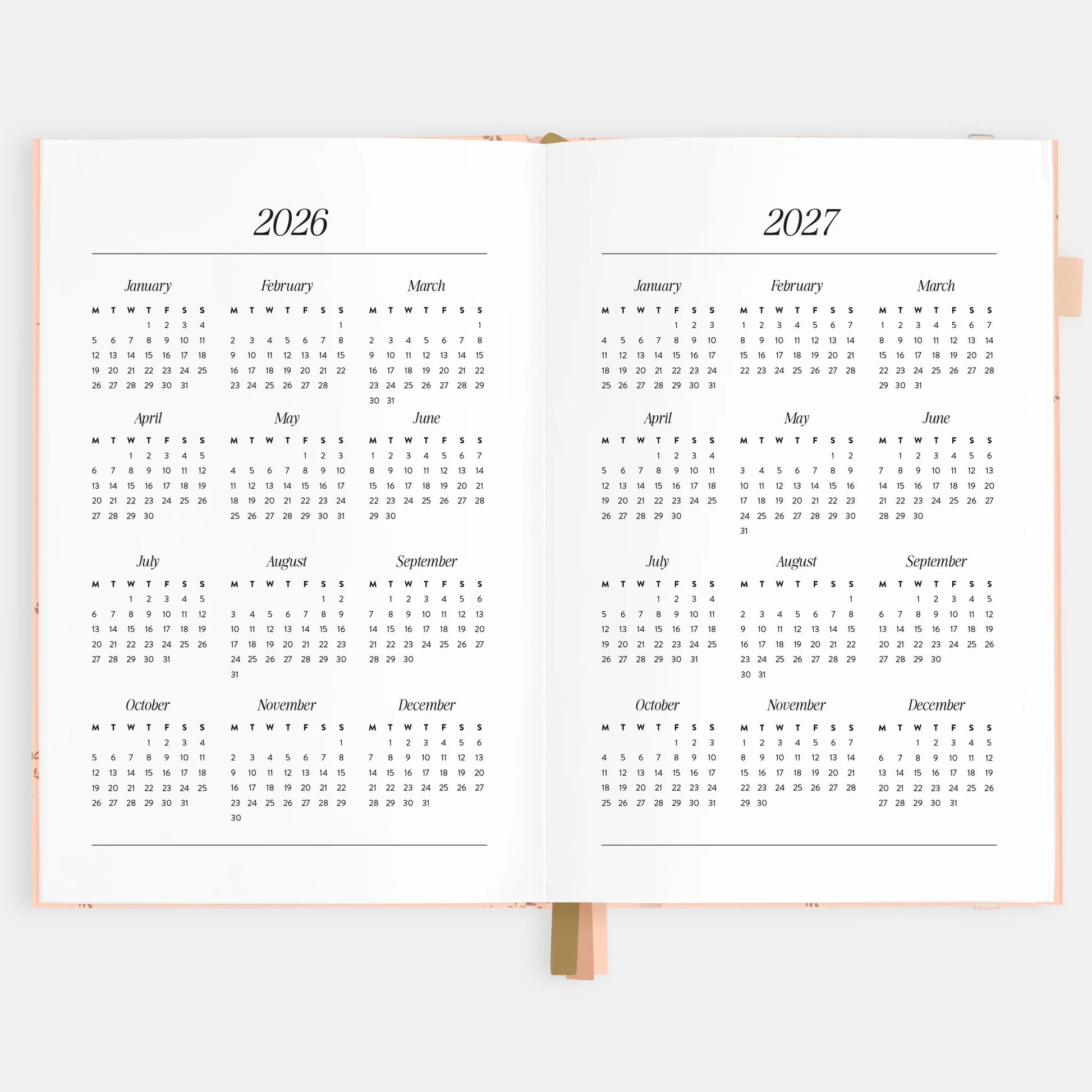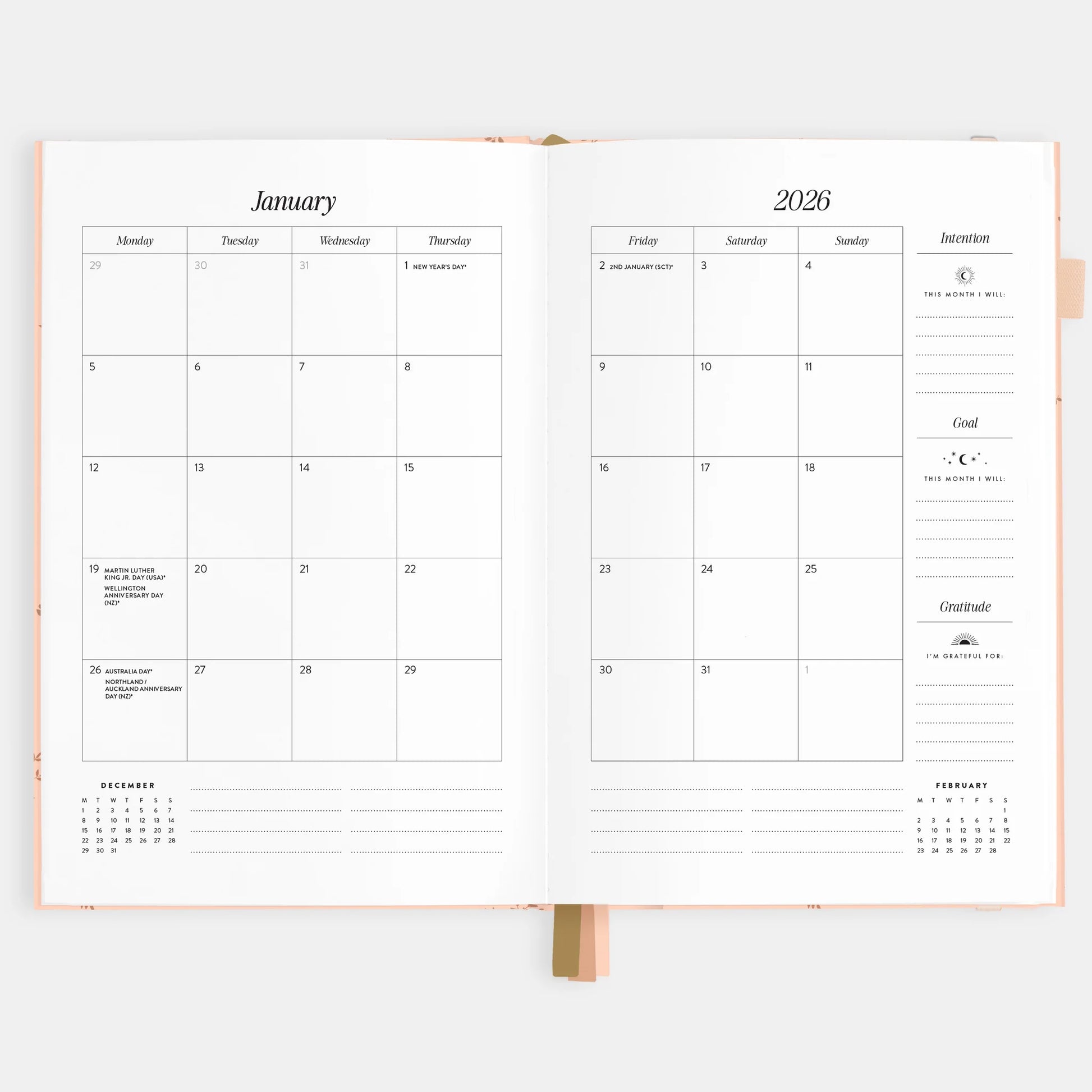 Each 2026 planner has been designed to be beautiful, functional and long-lasting, with patterned end pages, three ribbons and premium 120gsm FCS-certified paper. Holidays & observances for Australia, USA, Canada, UK & New Zealand. Packaged in a cello sleeve with gold foil bellyband.