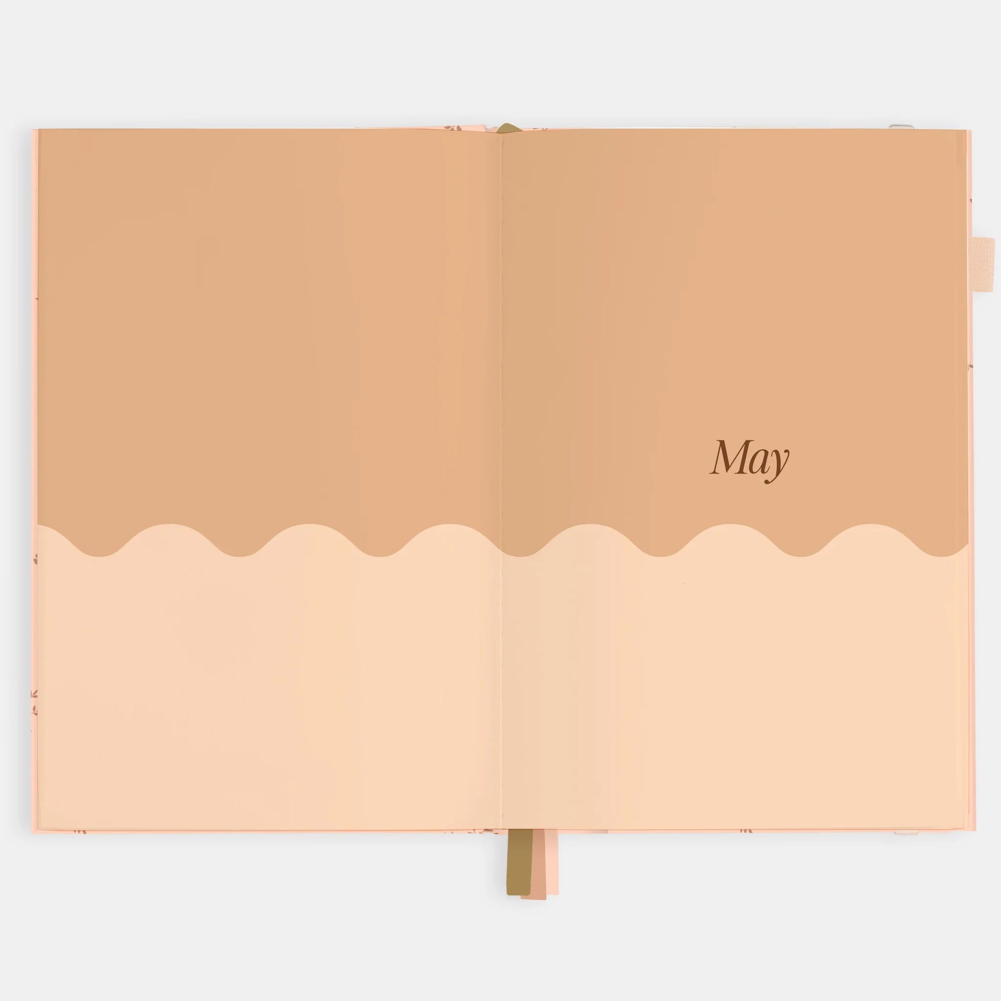 208 pages. One week per spread and monthly spreads at the beginning of each section. Gold foil stamped linen cover with gold foil edging. Three grosgrain ribbons in rust, blush and cream.