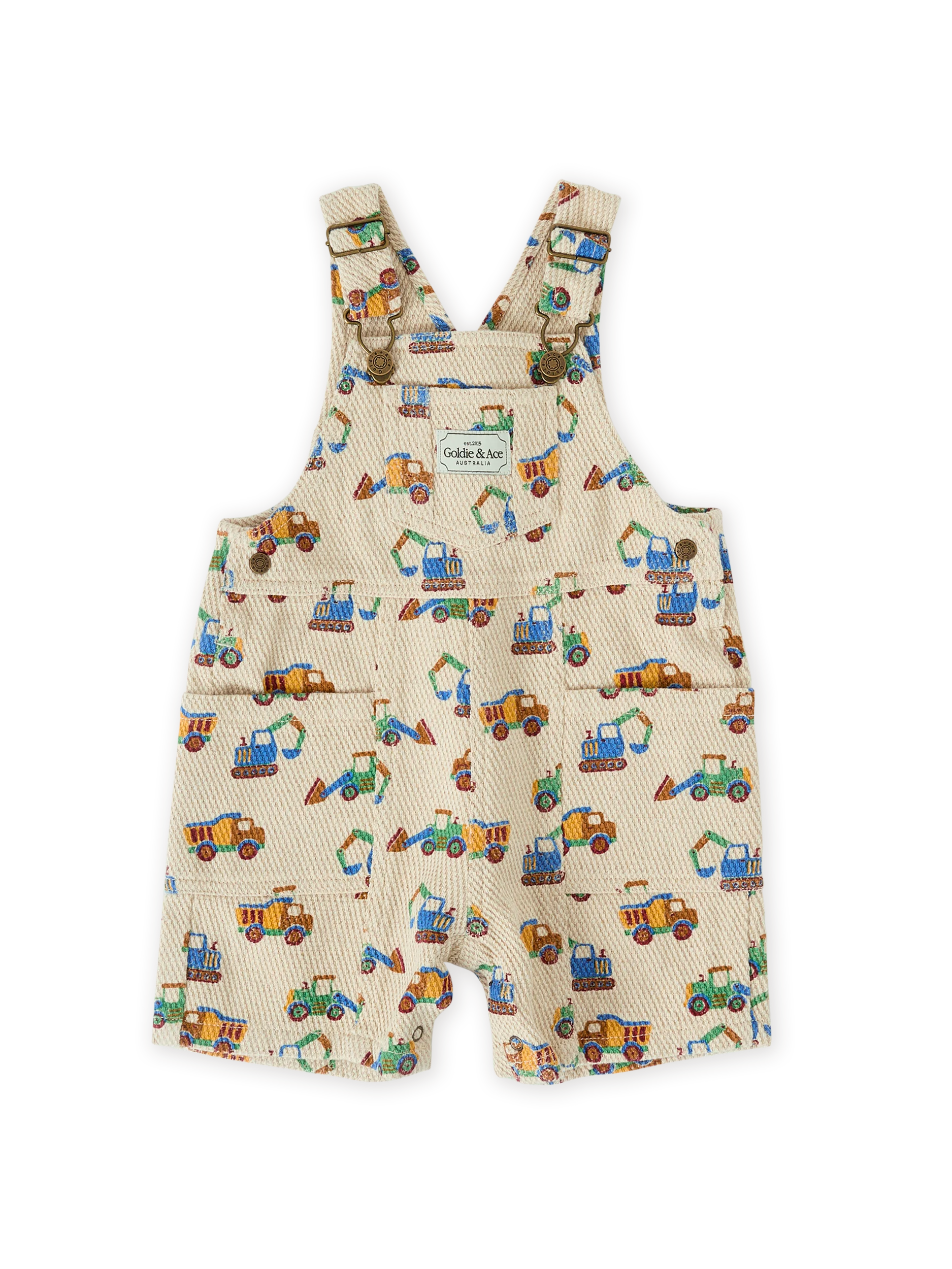 These short overalls mean business – the kind with sandpit construction crews, frequent snack breaks, and a wild imagination. With digger trucks printed across a thick woven cotton, they’re made for the ones whose engines are always running (even when they’re parked).