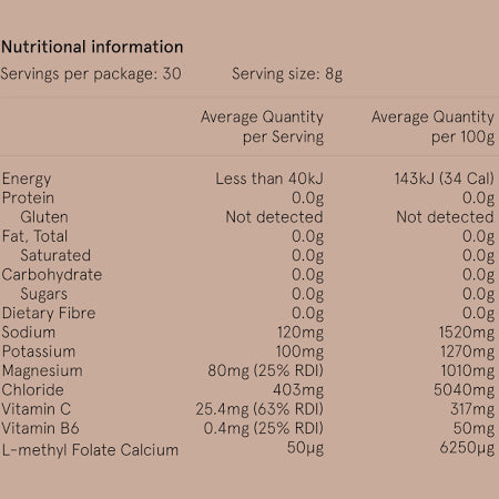 Electrolyte Mineral Salts Blend: Magnesium Chloride, Sodium Chloride, Mono Potassium Phosphate, Sodium Citrate. This blend helps to ensure you are hydrated to the optimal level.