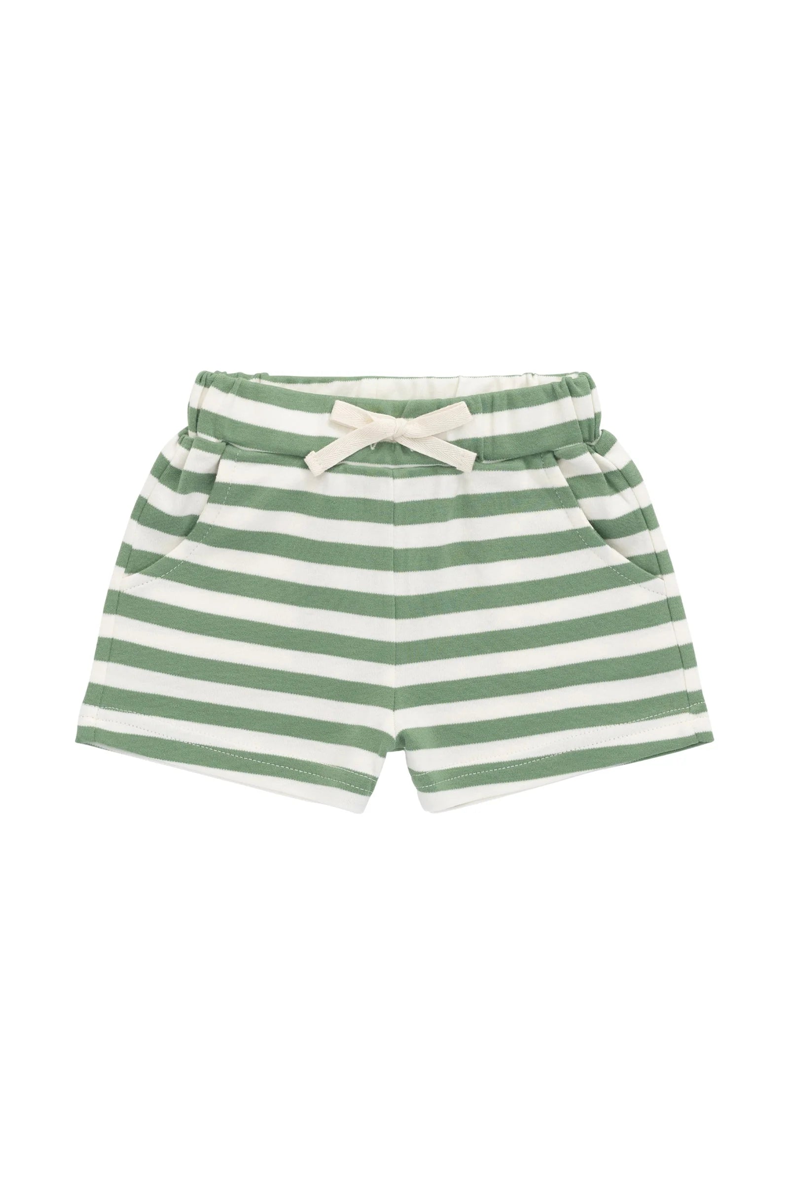 A sweet and stylish staple, the Pima Cotton Wesley Short – Essential Stripe Parchment/Snow Pea features soft green and white stripes, a delicate cream bow, and practical side pockets—perfect for everyday play with a touch of charm.