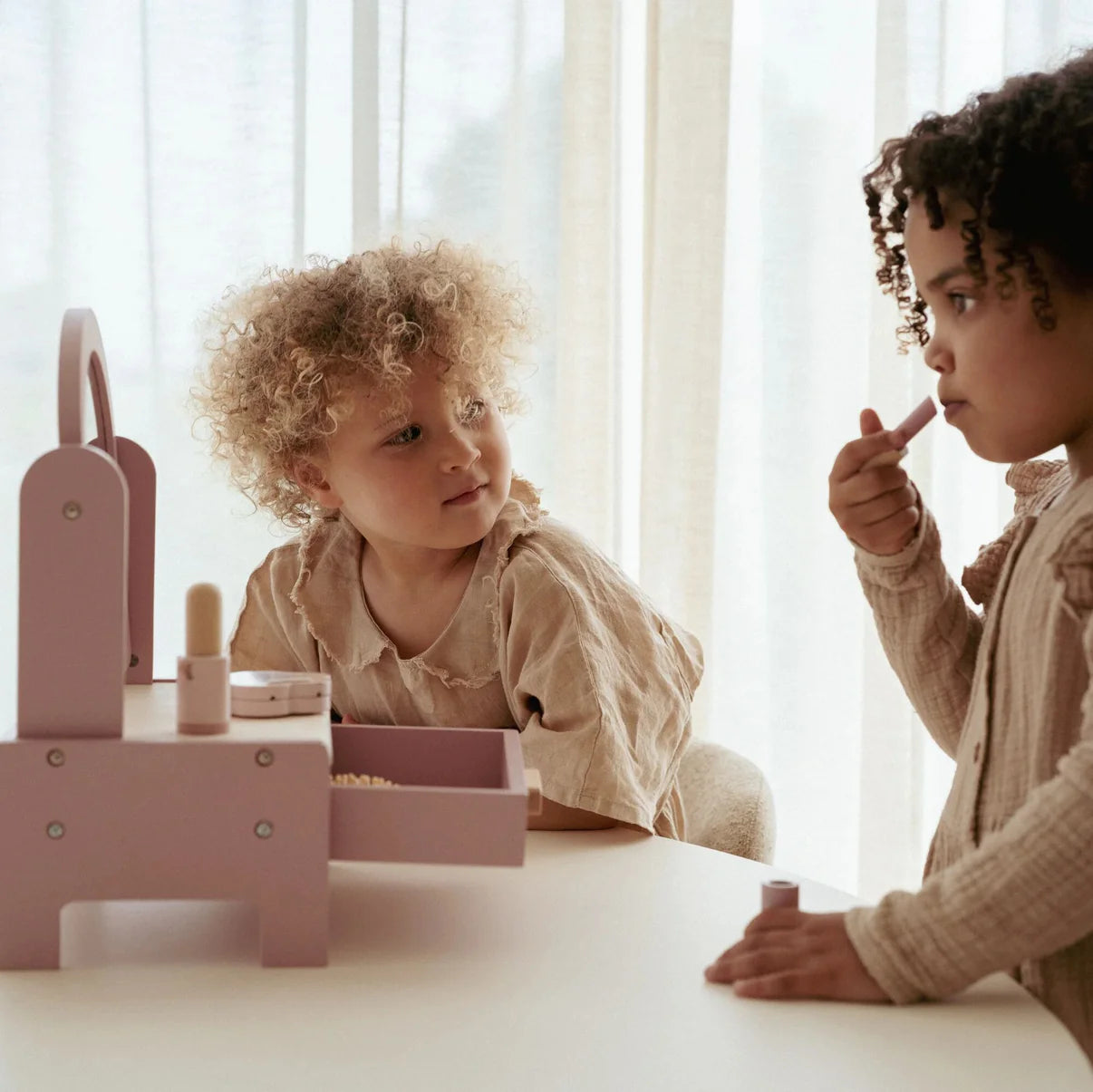 Get your best accessories ready and take a seat in front of the mirror! This gorgeous wooden dressing table features a rotating mirror and comes with six stylish beauty products, such as a hairbrush, lipstick, and perfume. Perfect for little beauty lovers who enjoy dressing up and pampering themselves. Let the imagination flow!