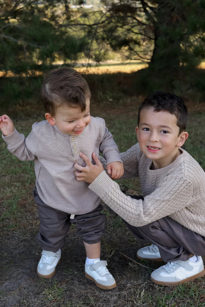 Wear it on its own for a classic look, or layer it under an overshirt for a sophisticated winter ensemble. This versatile piece combines comfort and style, allowing your little one to look effortlessly fashionable. With the Mocha Henley in their wardrobe, getting dressed will be both easy and stylish—fuss-free fashion at its best!