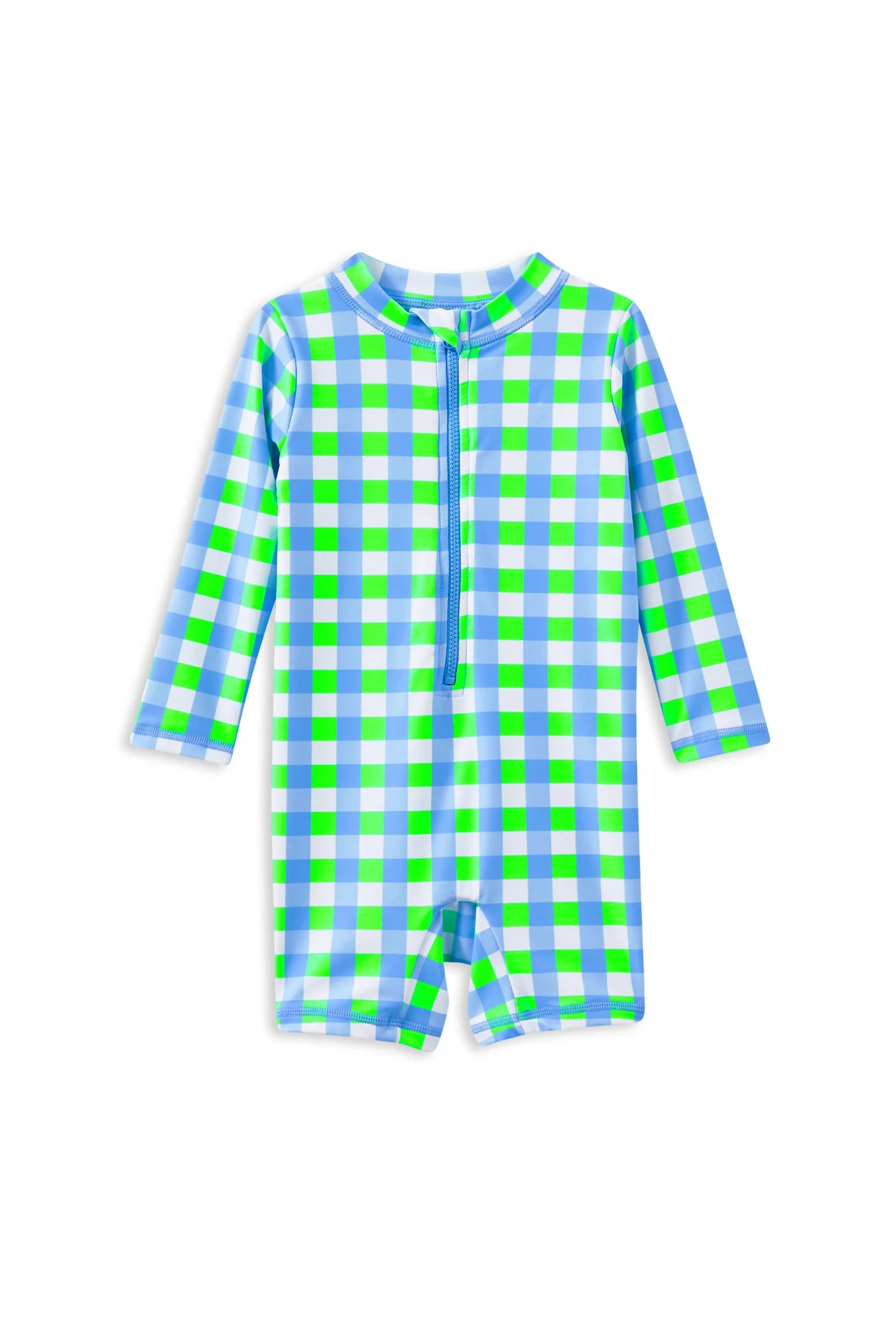Milky Clothing Check Long Sleeve Swimsuit. Keep the sun off their skin and the wind from their shoulders with the Check Long Sleeve Swimsuit. This swimsuit has full-length sleeves and UPF 50+ fabric offers maximum protection. Complete the look with our Summer Check Sun Hat and stay sun smart this Summer with Milky Clothing.