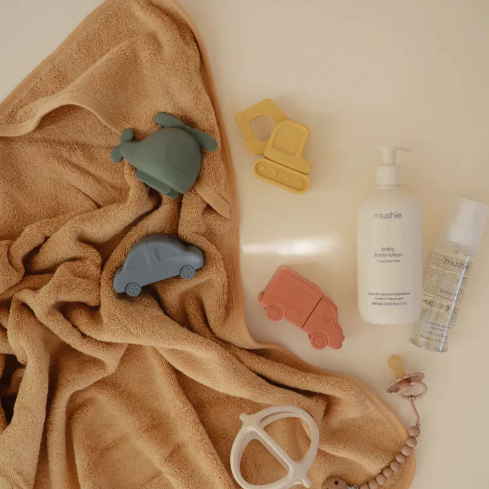Let your child's imagination travel far and wide with the vehicles bath play set that includes a helicopter, car, truck and excavator.