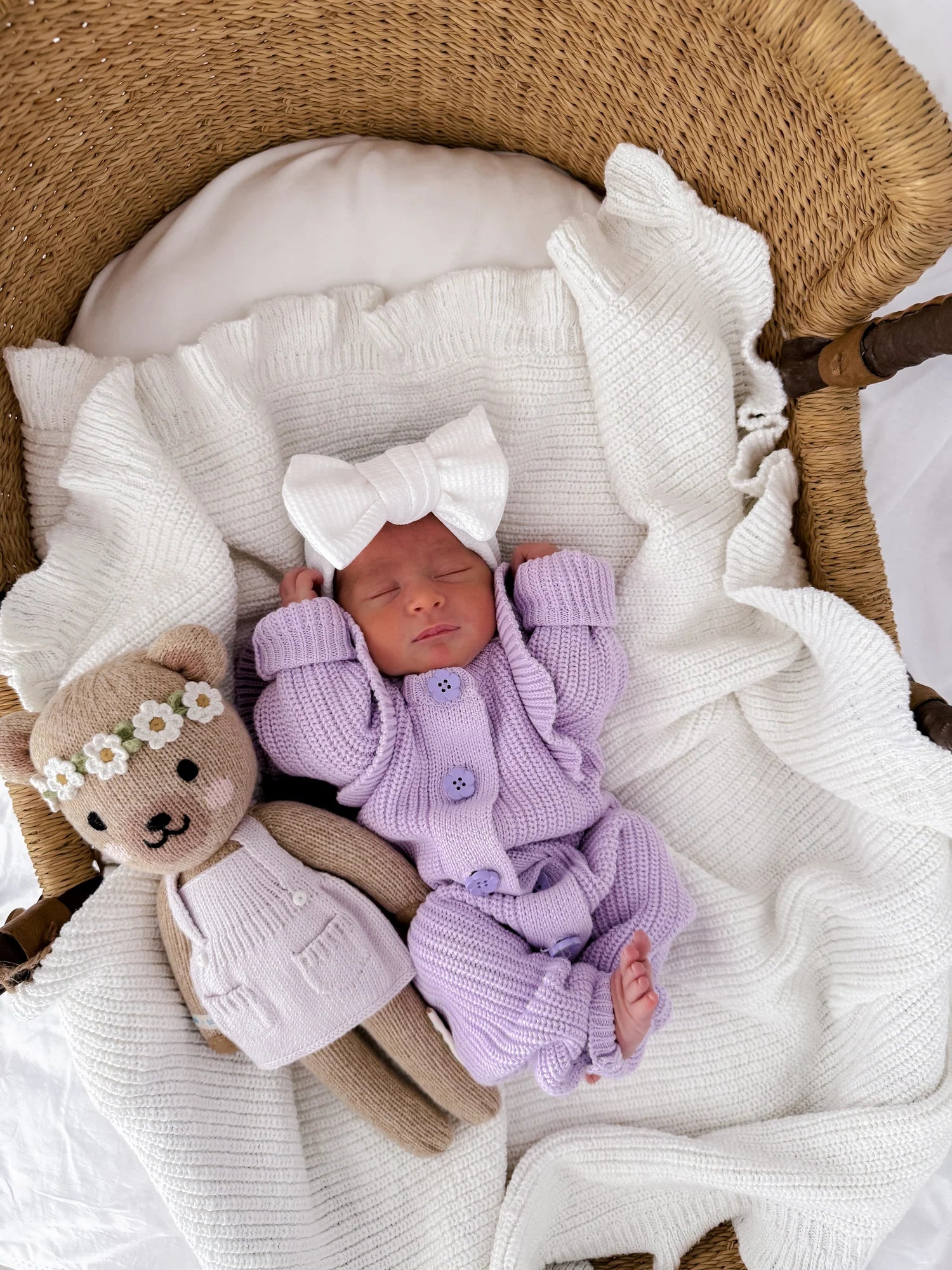Our ribbed flutter baby romper is made from soft cotton with ribbed detail. Providing ultimate comfort for your little one, it features a classic round neck and buttons down the front, perfect for everyday wear. The flutter on the shoulder and flower buttons adds the perfect little details.