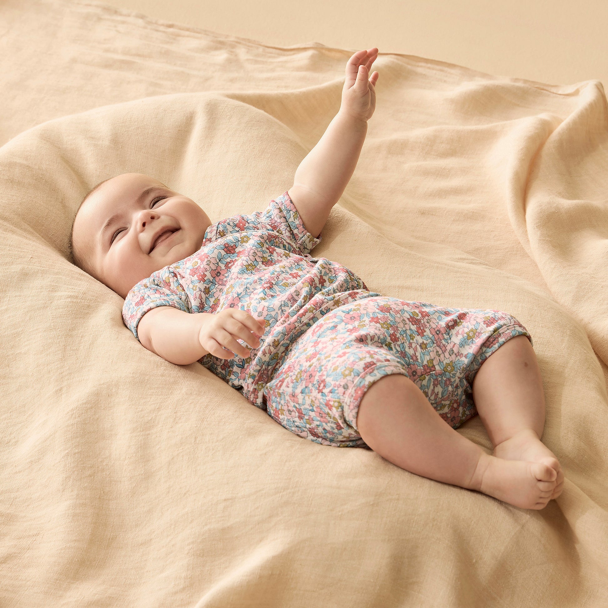 This Summer Bloom kimono set is a must-have for newborns. Made from soft, breathable GOTS-certified organic drop needle cotton, it features a pretty all-over Summer Bloom print and is gentle on delicate skin. The wrap-style kimono top ties easily at the side for fuss-free dressing, while the soft, elasticated shorts keep your little one comfy all day long. A practical and adorable set for everyday wear. Key Features: Kimono-style top with side tie for easy dressing. Soft elasticated waistband on shorts for a comfy fit. Lightweight and breathable fabric. Gentle on sensitive newborn skin. Made from GOTS-certified organic cotton. Sustainably produced. Packaged in a bio-degradable bag. Details: 95% GOTS-certified organic cotton, 5 % elastane. Certified by: Ecocert, EGL 212333. Machine washable. Made in India.